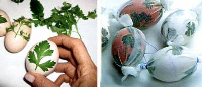 Если привязать к яйцам обычными швейными белыми нитками веточки укропа, листья петрушки